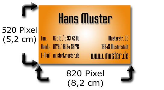 Tipps zum Erstellen einer Visitenkarte. In Ihrem Bildbearbeitungsprogramm erstellen Sie eine neue Datei. Die Datei sollte eine Größe von 820 x 520 Pixel (bei 100 - 300 dpi) haben. Wenn Sie Ihre Visitenkarte erstellt haben, speichern Sie diese bitte als JPEG, BMP, TIFF oder ähnliches ab. Diesen Entwurf können Sie uns dann per E-Mail zusenden.